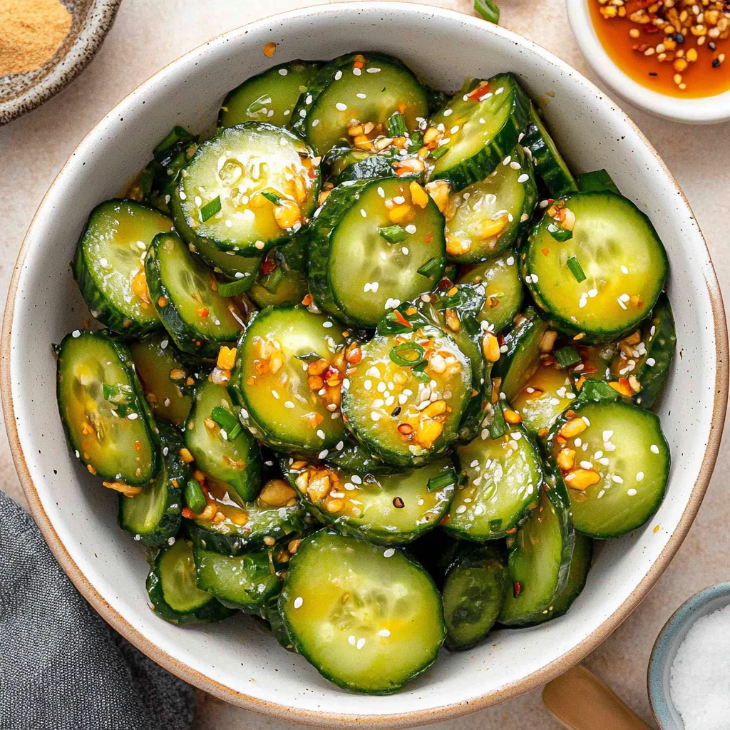 A refreshing and crunchy salad featuring cucumbers, sesame oil, and a tangy dressing, perfect as a side dish.