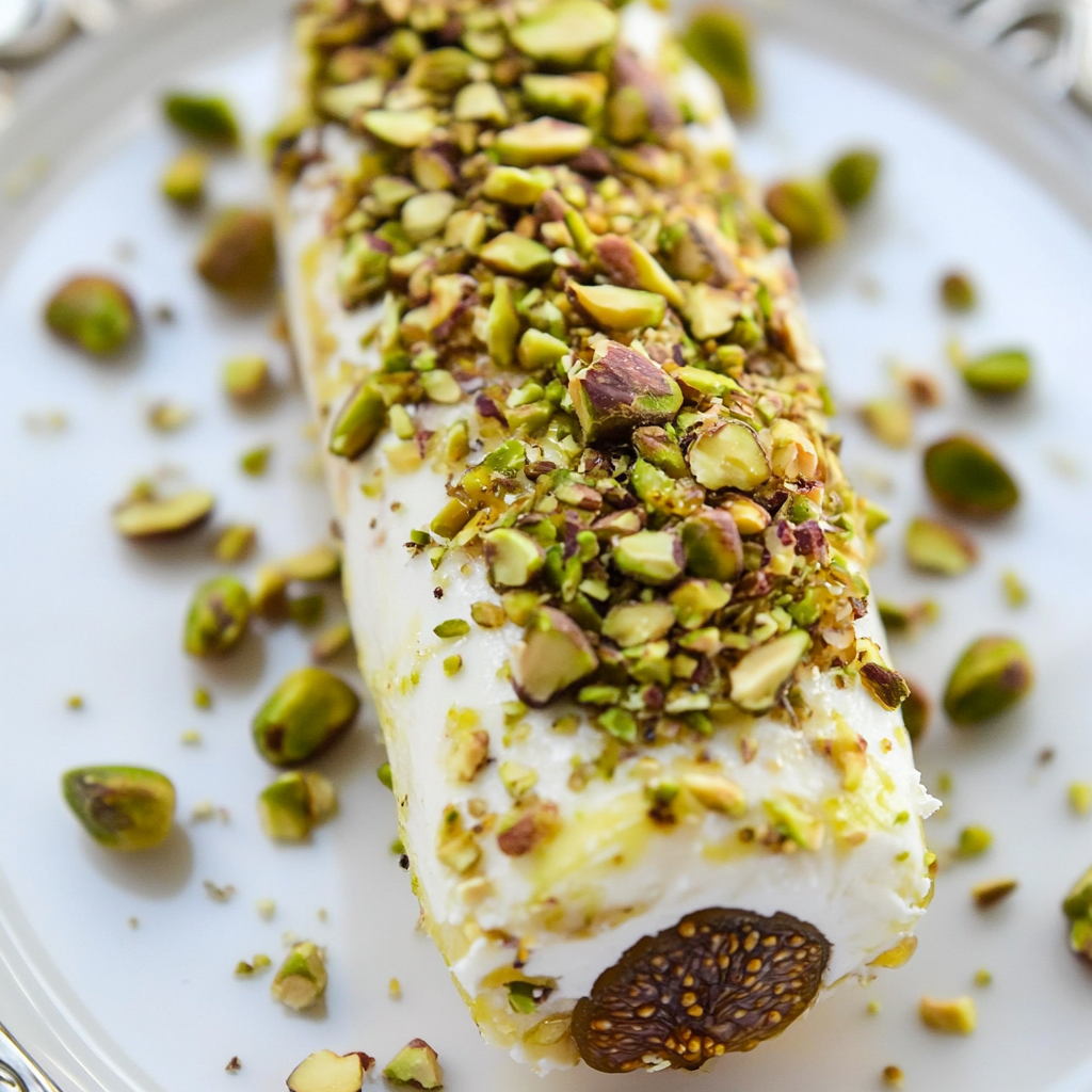 - Roll the softened goat cheese in the pistachios until evenly coated.